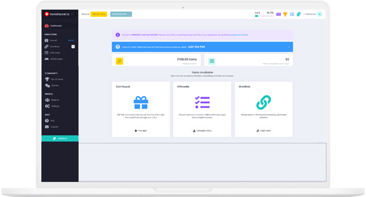 Hourly faucet 15-176 coins + loyalty bonus up to 100% extra, surveys and adwall, 5% interest when balance is higher than 35'000 coins, paid in coins (100coins = $0.01)